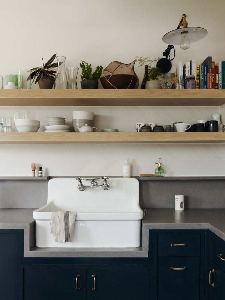 Galley kitchens tend to have a cave-like feel. But, getting rid of the upper cabinetry and putting in shelves can help provide more space.